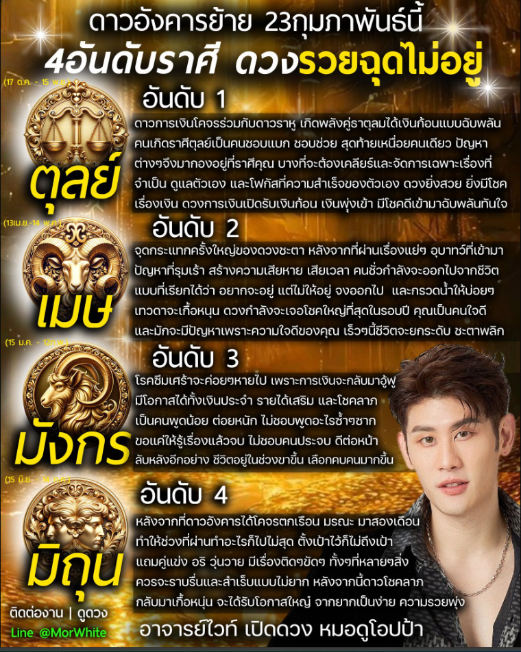 วันที่ 23 ก.พ. 69 ทาง อ.ไวท์ หมอดูโอปป้า เผย ดาวอังคารย้าย 23 กุมภาพันธ์นี้ 4 อันดับราศี ดวงรวยฉุดไม่อยู่ อันดับ 1 ดวงการเงินเปิดรับเงินก้อน เงินพุ่งเข้า มีโชคดีเข้ามาฉับพลัน เปิด 4 อันดับ มีราศีใดบ้าง
