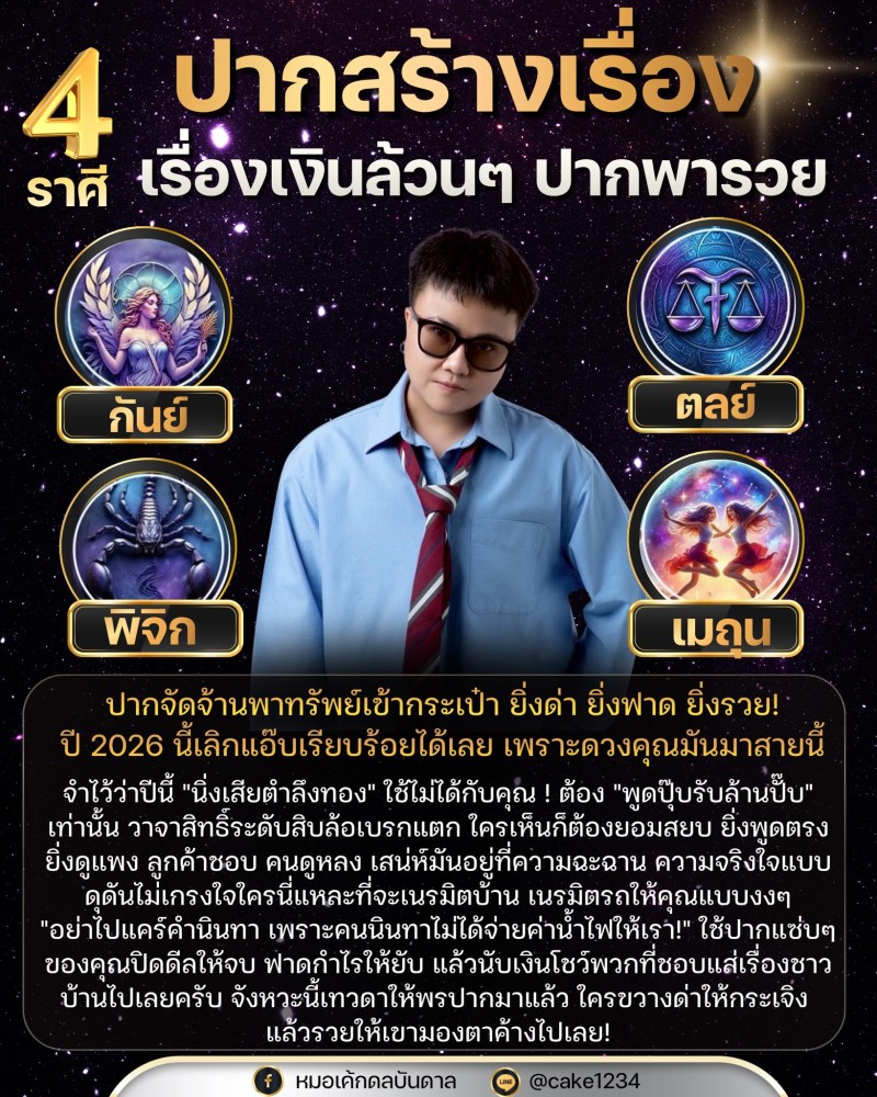 เรียกได้ว่า ทำเอาหลายคนจับตาไม่น้อย เมื่อ หมอเค้ก ดลบันดาล ออกมาเผยคำทำนายดวงปี 2026 ชี้ว่ามี 4 ราศีที่ดวงการเงินโดดเด่นเป็นพิเศษ เพราะพลังของคำพูด สามารถเปลี่ยนโอกาสให้กลายเป็นรายได้แบบไม่คาดคิด