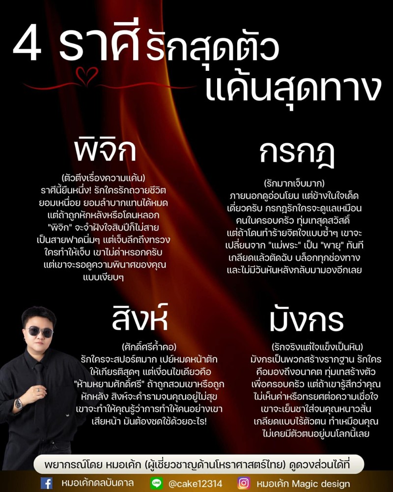 เรียกได้ว่า ทำเอาสายมู และคนชอบดูดวงหูผึ่งไม่น้อย เมื่อ หมอเค้ก ดลบันดาล นักพยากรณ์ชื่อดัง ออกมาเปิดคำทำนายเกี่ยวกับนิสัยความรักของ 4 ราศี ที่ขึ้นชื่อว่า รักแรง แค้นแรง หากรักใครจะทุ่มเทสุดใจ แต่ถ้าโดนหักหลังขึ้นมา บอกเลยว่าเรื่องนี้ไม่จบง่ายๆ