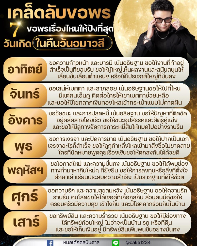 ส่วนคนเกิดวันจันทร์ เหมาะกับการขอเรื่องเสน่ห์ เมตตามหานิยม รวมถึงโชคลาภแบบไม่คาดคิ