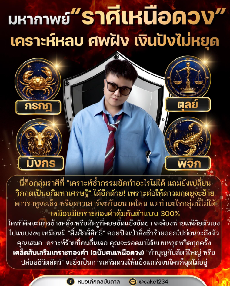 กรกฎ ตุลย์ มังกร พิจิก โดยนี่คือกลุ่มราศีที่ “เคราะห์ซ้ำกรรมชัดทำอะไรไม่ได้ แถมยังเปลี่ยนวิกฤตเป็นอภิมหาเศรษฐี” ได้อีกด้วย! เพราะต่อให้ดาวมฤตยูจะย้าย ดาวราหูจะเล็ง หรือดาวเสาร์จะทับขนาดไหน แต่ทำอะไรกล่มนี้ได้ เหมือนมีเกราะทองคำคุ้มกันตัวแบบ 300% ใครที่คิดจะแทงข้างหลัง หรือศัตรูที่คอยขัดแข้งขัดขา จะต้องพ่ายแพ้ภัยตัวเองไปแบบงงๆ เหมือนมี “สิ่งศักดิ์สิทธิ์” คอยปัดเป่าสิ่งชั่วร้ายออกไปก่อนจะถึงตัวคุณเสมอ เคราะห์ร้ายที่คนอื่นเจอ คุณจะรอดมาได้แบบหวุดหวิดทุกครั้ง เคล็ดลับเสริมเกราะทองคำ (ฉบับคนเหนือดวง) “ทำบุญกับสัตว์ใหญ่ หรือปล่อยชีวิตสัตว์” จะยิ่งเป็นการเสริมดวงให้แข็งแกร่งจนใครก็ฉุดไม่อยู่