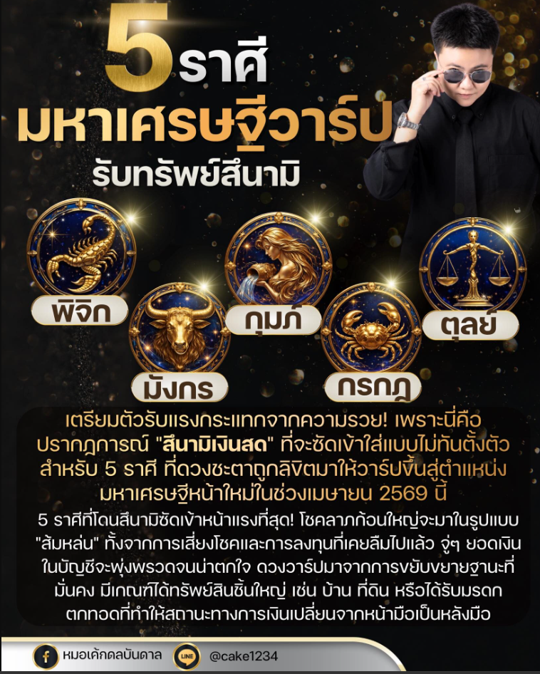 วันที่ 6 เม.ย. 69 หมอเค้กดลบันดาล เผยถึงดวงชะตาราศีมหาเศรษฐีวาร์ป รับทรัพย์สึนามิ เตรียมตัวรับแรงกระแทกจากความรวย เพราะนี่คือปรากฏการณ์ “สึนามิเงินสด” ที่จะซัดเข้าใส่แบบไม่ทันตั้งตัว ทั้ ง5 ราศีนี้ ดวงชะตาถูกลิขิตมาให้วาร์ปขึ้นสู่ตำแหน่งมหาเศรษฐีหน้าใหม่ในช่วงเม.ย.2569