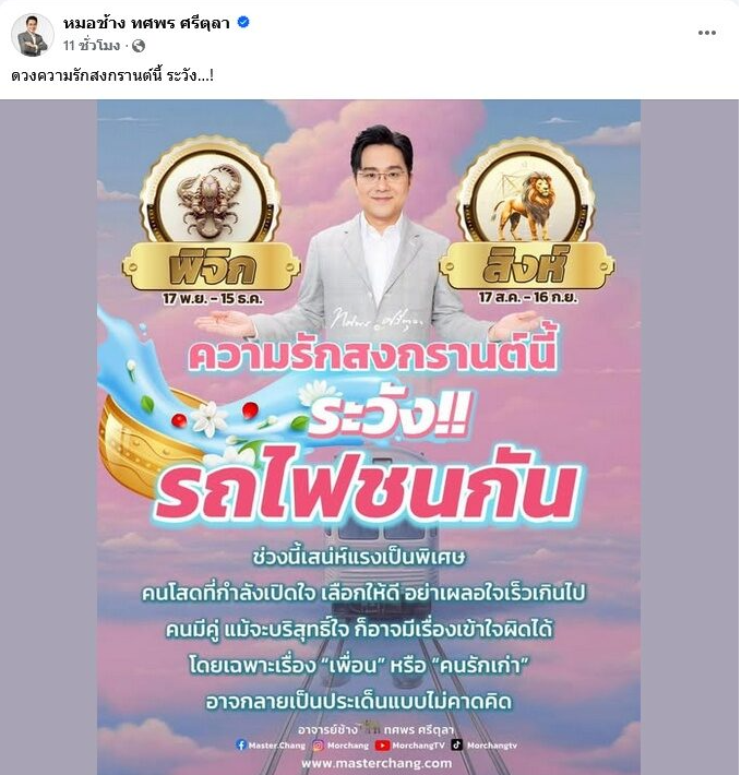วันที่ 8 เม.ย. 69 หมอช้าง เตือน 2 ราศี สงกรานต์นี้มีเรื่องต้องระวัง “ดวงความรักสงกรานต์นี้ ระวัง…! รถไฟชนกัน ช่วงนี้เสน่ห์แรงเป็นพิเศษ คนโสด ที่กำลังเปิดใจ เลือกให้ดี อย่าเผลอใจเร็วเกินไป “คนมีคู่ แม้จะบริสุทธิ์ใจ ก็อาจมีเรื่องเข้าใจผิดได้ โดยเฉพาะเรื่อง “เพื่อน” หรือ “คนรักเก่า” อาจกลายเป็นประเด็นแบบไม่คาดคิด”