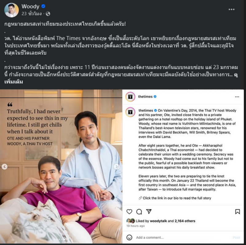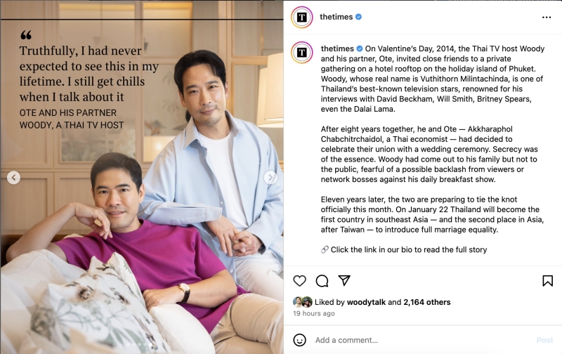 เรียกได้ว่าเป็นอีกหนึ่งคู่ที่ได้รอประเทศไทยมีการรับรองสมรสเท่าเทียมสำหรับพิธีกรอย่าง วู้ดดี้ วุฒิธร มิลินทจินดา และแฟนหนุ่ม โอ๊ต อัครพล ล่าสุดด้านสื่อระดับโลกอย่างthetimes ได้ออกมาตีข่าวเรื่องสมรสเท่าเทียมในประเทศไทยของคู่ วู้ดดี้ ว่า ในวันวาเลนไทน์ ปี 2014 พิธีกรโทรทัศน์ชื่อดังของไทย วู้ดดี้ วุฒิธร มิลินทจินดา และคู่ชีวิต โอ๊ต อัครพล ชุบจิตร์ไชยดล ได้เชิญเพื่อนสนิทมาร่วมงานเลี้ยงส่วนตัวบนดาดฟ้าของโรงแรมแห่งหนึ่งบนเกาะภูเก็ต