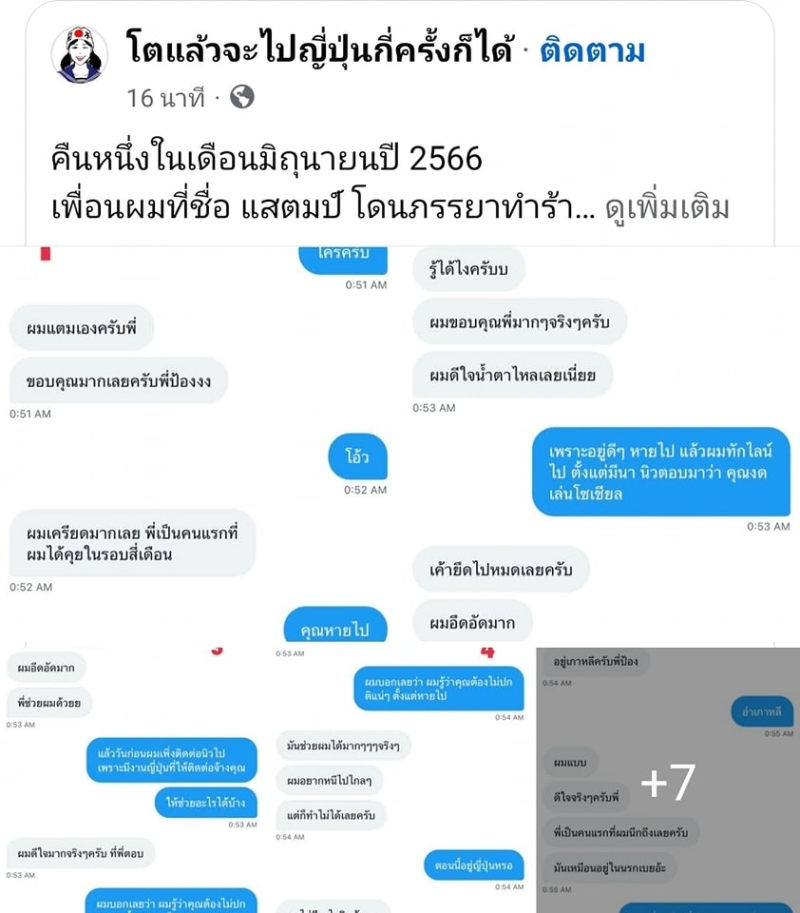 ล่าสุด ทางด้านเพจ โตแล้วจะไปญี่ปุ่น กี่ครั้งก็ได้ ได้ออกมาเคลื่อนไหวบนโลกโซเชียล พร้อมอ้างว่า ตนคือป้อง เพื่อนสนิทของแสตมป์ โดยได้ออกมาโพสต์แชทบทสนทนาระหว่างตนและสแตมป์ ที่มีใจความประมาณว่า สแตมป์ไม่โอเคกับการแต่งงานและอยากหย่ากับนิวภรรยาสาว พร้อมอยากไปเริ่มต้นชีวิตใหม่ ก่อนเผยถึงสาเหตุว่า ที่ผ่านมา โดนภรรยาทำร้ายจิตใจแตกละเอียด เหมือนตกอยู่ในนรกประเทศเกาหลีใต้