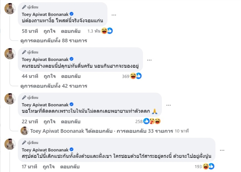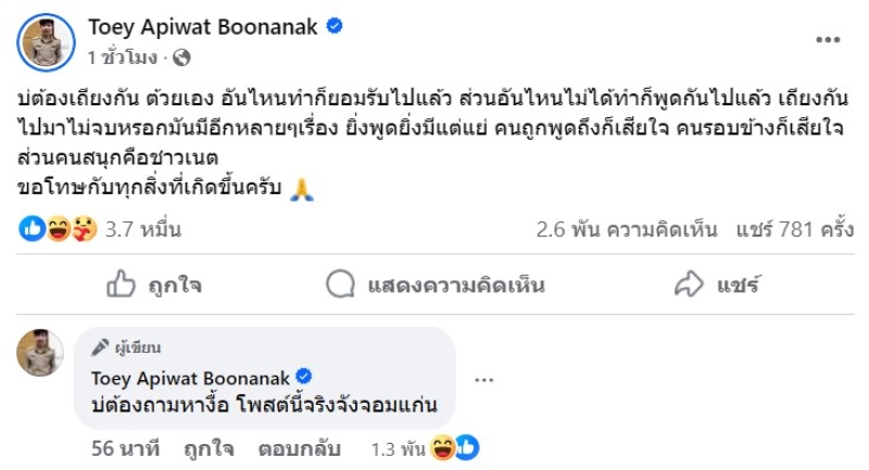และต่อมาด้านครูเต้ย ได้ออกมาโพสต์ว่า บ่ต้องเถียงกัน ต้วยเอง อันไหนทำก็ยอมรับไปแล้ว ส่วนอันไหนไม่ได้ทำก็พูดกันไปแล้ว เถียงกันไปมาไม่จบหรอกมันมีอีกหลายๆเรื่อง ยิ่งพูดยิ่งมีแต่แย่ คนถูกพูดถึงก็เสียใจ คนรอบข้างก็เสียใจ ส่วนคนสนุกคือชาวเนต ขอโทษกับทุกสิ่งที่เกิดขึ้นครับ