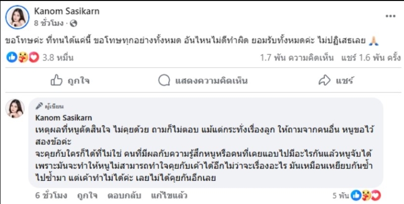 เรียกได้ว่า กำลังเป็นเดือดในโลกโซเซียล หลังเปิดตัวแฟนใหม่ กระแสดราม่าร้อนระอุเช่นกัน ขนม ศศิกานต์ อดีตภรรยา ครูเต้ย อภิวัฒน์ ด้าน ขนม ได้โพสต์ข้อความว่า ขอโทษค่ะ ที่ทนได้แค่นี้ ขอโทษทุกอย่างทั้งหมด อันไหนไม่ดีทำผิด ยอมรับทั้งหมดค่ะ ไม่ปฏิเสธเลย