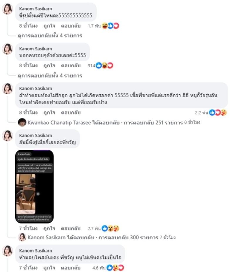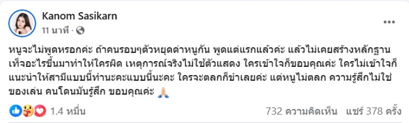 ล่าสุด ขนม ก็ได้โพสต์ผ่านfacebook เช่นกันว่า หนูจะไม่พูดหรอกค่ะ ถ้าคนรอบๆตัวหยุดด่าหนูกัน พูดแต่แรกแล้วค่ะ แล้วไม่เคยสร้างหลักฐานเท็จอะไรขึ้นมาทำให้ใครผิด เหตุการณ์จริงไม่ใช้ตัวแสดง ใครเข้าใจก็ขอบคุณค่ะ ใครไม่เข้าใจก็แนะนำให้สามีแบบนี้ทำนะคะแบบนี้นะคะ ใครจะตลกก็ขำเลยค่ะ แต่หนูไม่ตลก ความรู้สึกไม่ใช่ของเล่น คนโดนมันรู้สึก ขอบคุณค่ะ