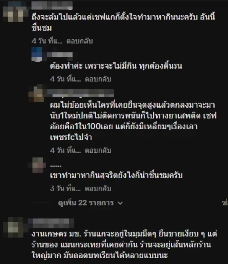 ด้านชาวเน็ตที่เห็นภาพเชฟอ้อยต่างเข้ามาให้กำลังอาทิ ถึงจะล้มไปแล้วแต่เชฟแกก็ตั้งใจทำมาหากินนะครับ อันนี้ชื่นชม , เขาทำมาหากินสุจริตยังไงก็น่าชื่นชมครับ , คนล้มอย่าข้าม ยังไงเขาก็ยังขยันทำมาหากิน ,เชฟอ้อย ผู่ขายทุกอย่าง ยอมรับความใจสู้ของแกนะ เป็นต้น