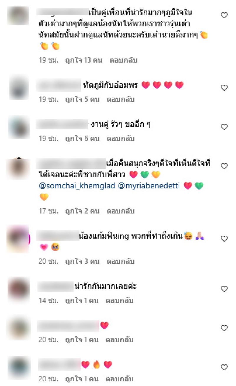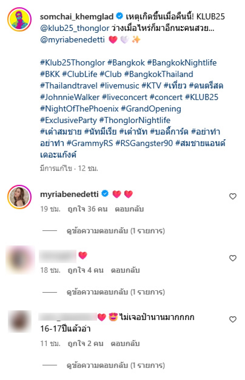พร้อมเขียนแคปชั่นว่า เหตุเกิดขึ้นเมื่อคืนนี้! KLUB25 @klub25_thonglor ว่างเมื่อไหร่ก็มาอีกนะคนสวย... @myriabenedetti ท่ามกลางแฟนๆต่างเข้ามาคอมเมนต์กันอย่างมาก อาทิ ไม่เจอป๋านานมาก 16-17ปีแล้วอ่า,เป็นคู่เพื่อนที่น่ารักมากๆภูมิใจในตัวเต๋ามากๆที่ดูแลน้องนัทไห้พวกเราชาวรุ่นเต๋านัทสมัยนั้นฝากดูแลนัทด้วยนะครับเต๋านายดีมากๆ,งานคู่ รัวๆ ขออีกๆ เป็นต้น