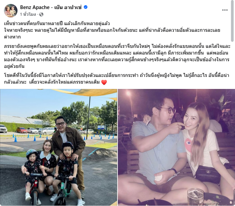 ทำเอาแฟนๆต่างชื่นชมทัศนคติที่ดีของ เบ๊น อาปาเช่ ที่ล่าสุดได้ออกมาโพสต์ให้แง่คิดของคู่รักที่คบมานาน แต่สุดท้ายจบด้วยการเลิกรากันอยู่หลายคู่ โดย เบ๊น ได้โพสต์ข้อความผ่านทางเฟซบุ๊คส่วนตัว Benz Apache - เบ๊น อาปาเช่ ระบบุว่า ใจหายจริงๆนะ หลายคู่ไม่ได้มีปัญหามือที่สามหรือนอกใจกันด้วยนะ แต่ที่น่ากลัวคือความอิ่มตัวและการละเลยต่างหาก