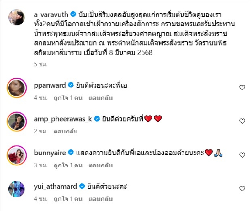 เรียกได้ว่า เป็นอีกคู่ที่แฟนๆต่างรอคอยวันแต่งแล้ว สำหรับ พิธีกรดัง อย่าง เอ วราวุธ เจนธนากุล และดาราสาว ออม มัฑณียา ที่ได้เซอร์ไพรส์ขอแต่งงานไปเมื่อปีที่แล้ว ล่าสุด ทั้งคู่ ก็ได้ควงคู่เข้าน้ำพระพุทธมนต์ โดยได้เผยว่า นับเป็นสิริมงคลอันสูงสุดแก่การเริ่มต้นชีวิตคู่ของเราทั้ง2คนที่มีโอกาสเข้าเฝ้าถวายเครื่องสักการะ กราบขอพรและรับประทานน้ำพระพุทธมนต์จากสมเด็จพระอริยวงศาคตญาณ สมเด็จพระสังฆราช สกลมหาสังฆปริณายก ณ พระตำหนักสมเด็จพระสังฆราช วัดราชบพิธสถิตมหาสีมาราม เมื่อวันที่ 8 มีนาคม 2568