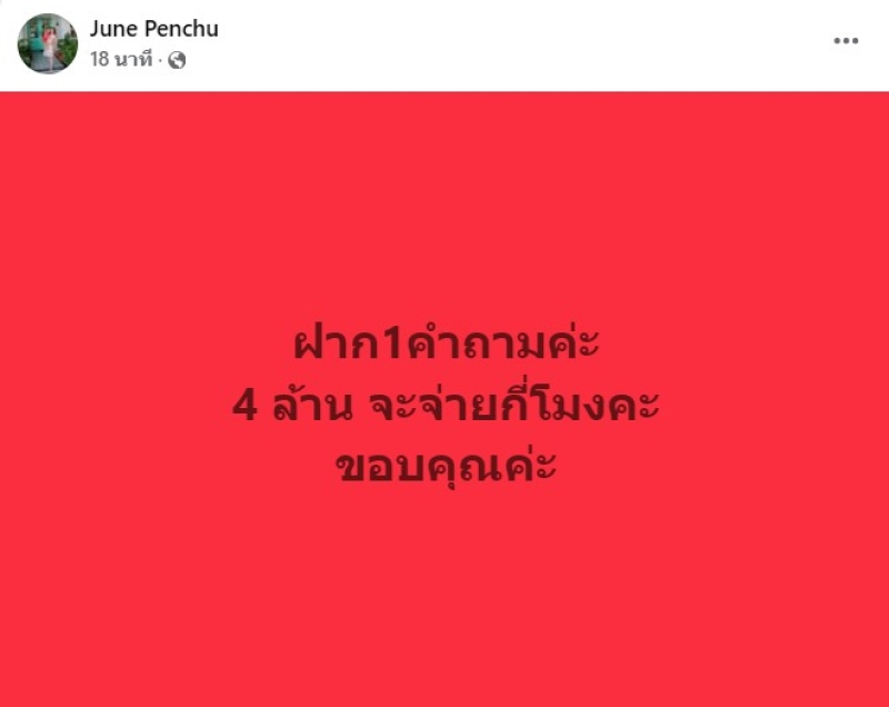 ล่าสุด ทางอดีตภรรยา หนุ่ม กะลา อย่างแม่จูน ได้โพสต์สั้นๆว่า ฝาก1คำถามค่ะ 4 ล้าน จะจ่ายกี่โมงคะ ขอบคุณค่ะ