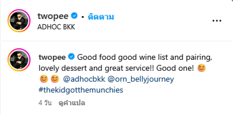 เรียกได้ว่าเป็นอีกหนึ่งแร็ปเปอร์หนุ่ม โต้ง ทูพี ที่ยังคงถูกจับตามองถึงความสัมพันธ์ของนักแสดงสาว พลอย เฌอมาลย์ ที่ยังคงไม่แน่ชัดจนแฟนๆต่างสงสัยว่าความสัมพันธ์ของทั้งคู่ยังรักกันดีอยู่หรือไม่ ล่าสุด โต้ง ทูพี ได้ออกมาโพสต์อยู่ร้านอาหารสุดหรูผ่านทางอินสตาแกรม twopee