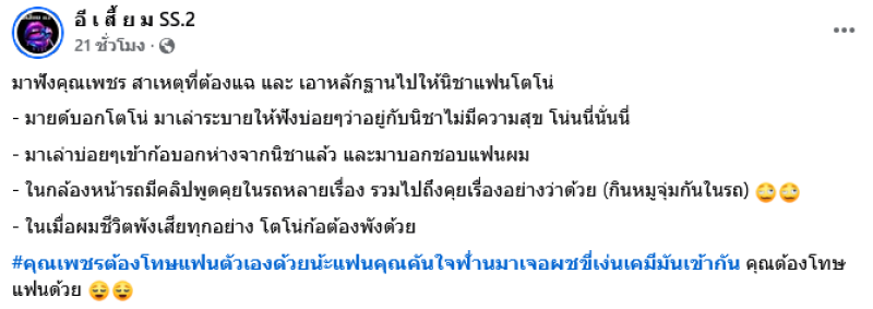 เรียกได้ว่ากำลังเป็นประเด็นดราม่าร้อนแรงสนั่นโซเชียลเลยทีเดียวสำหรับข่าวพระเอกร้องได้เพลง แอบนอกใจแฟนสาว โดยชาวเน็ตต่างโยงไปที่คู่ของ โตโน่ ภาคิน กับ ณิชา ณัฏฐณิชา ล่าสุดทางด้านเพจ อีเสี้ยม SS.2 ได้สัมภาษณ์ คุณเพชร แฟนหนุ่มของหญิงสาวที่ตกเป็นบุคคลที่สาม