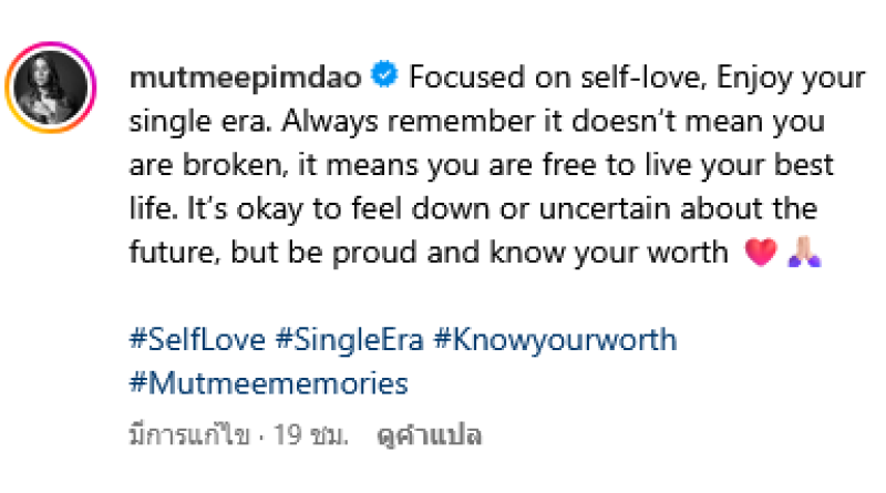 are broken, it means you are free to live your best life. It’s okay to feel down or uncertain about the future, but be proud and know your worth (มุ่งมั่นกับการรักตัวเอง สนุกกับยุคโสดของคุณ จำไว้เสมอว่ามันไม่ได้หมายความว่าคุณหมดใจ แต่มันหมายความว่าคุณมีอิสระที่จะใช้ชีวิตให้ดีที่สุด ไม่ว่าอนาคตจะน้อยใจ หรือไม่แน่นอน แต่จงภูมิใจและรู้คุณค่าของตัวเอง)