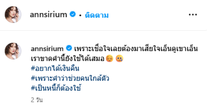 เรียกได้ว่าเป็นอีกหนึ่งนักแสดงรุ่นใหญ่มากฝีมือสำหรับ แอน สิเรียม ที่ล่าสุดได้ออกมาโพสต์ทวงเงินออกสื่อ หลังถูกใกล้ตัวยืมเงินไม่ยอมคืน โดย แอน สิเรียม ได้โพสต์ภาพพร้อมแคปชั่นผ่านทางอินสตาแกรม annsirium