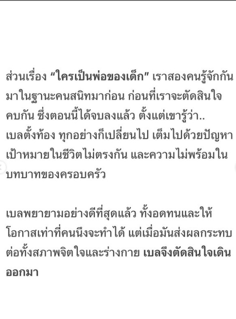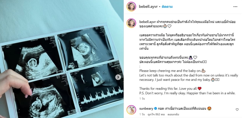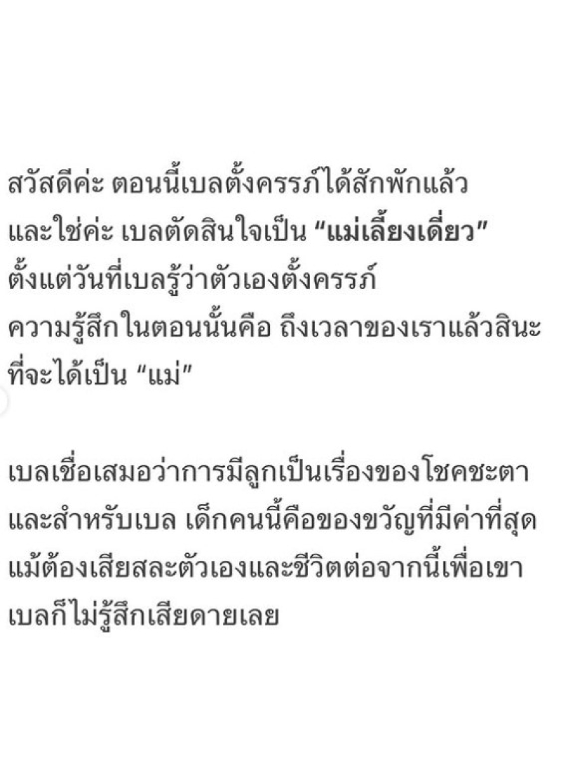 ซึ่งโพสต์ดังกล่าว บีเบล ได้ลงข้อความเล่าว่า สวัสดีค่ะ ตอนนี้เบลตั้งครรภ์ได้สักพักแล้ว และใช่ค่ะ เบลตัดสินใจเป็น แม่เลี้ยงเดี่ยว ตั้งแต่วันที่เบลรู้ว่าตัวเองตั้งครรภ์ ความรู้สึกในตอนนั้นคือ ถึงเวลาของเราแล้วสินะ ที่จะได้เป็น แม่ เบลเชื่อเสมอว่าการมีลูกเป็นเรื่องของโชคชะตา และสำหรับเบล เด็กคนนี้คือของขวัญที่มีค่าที่สุด แม้ต้องเสียสละตัวเองและชีวิตต่อจากนี้เพื่อเขา เบลก็ไม่รู้สึกเสียดายเลย