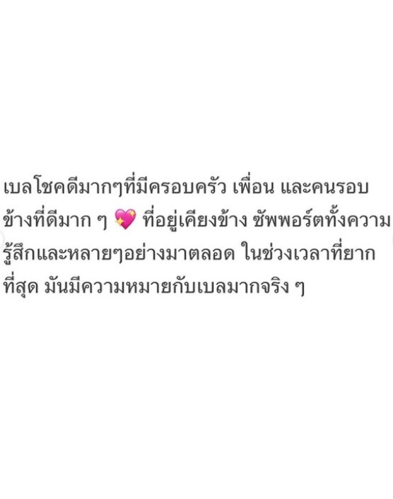 เบลโชคดีมาก ๆ ที่มีครอบครัว เพื่อน และคนรอบข้างที่ดีมาก ๆ ที่อยู่เคียงข้าง ซัพพอร์ตทั้งความรู้สึกและหลาย ๆ อย่างมาตลอด ในช่วงเวลาที่ยากที่สุด มันมีความหมายกับเบลมากจริง ๆ