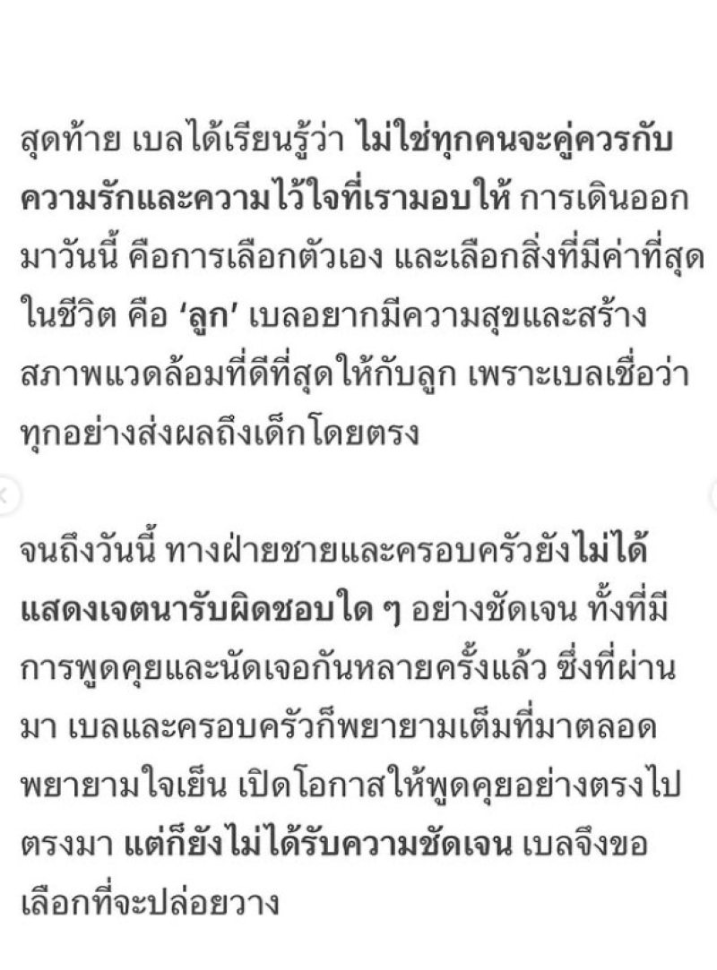 จนถึงวันนี้ ทางฝ่ายชายและครอบครัวยังไม่ได้แสดงเจตนารับผิดชอบใด ๆ อย่างชัดเจน ทั้งที่มีการพูดคุยและนัดเจอกันหลายครั้งแล้ว ซึ่งที่ผ่านมา เบลและครอบครัวก็พยายามเต็มที่มาตลอด พยายามใจเย็น เปิดโอกาสให้พูดคุยอย่างตรงไปตรงมา แต่ก็ยังไม่ได้รับความชัดเจน เบลจึงขอเลือกที่จะปล่อยวาง