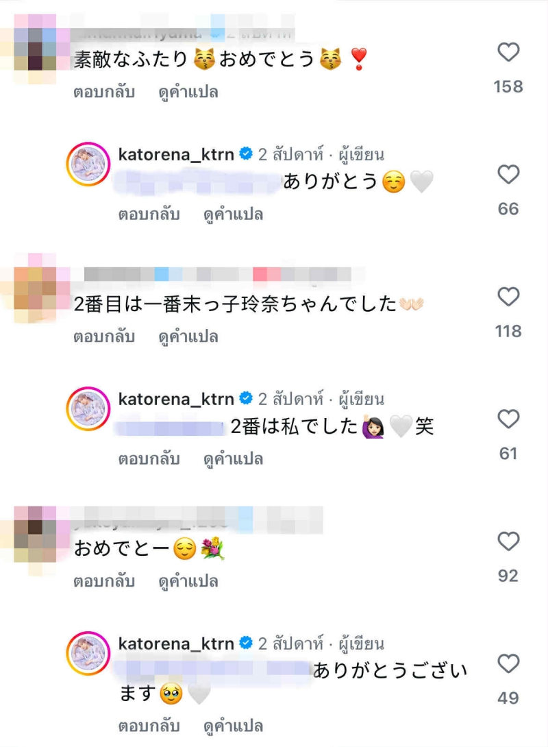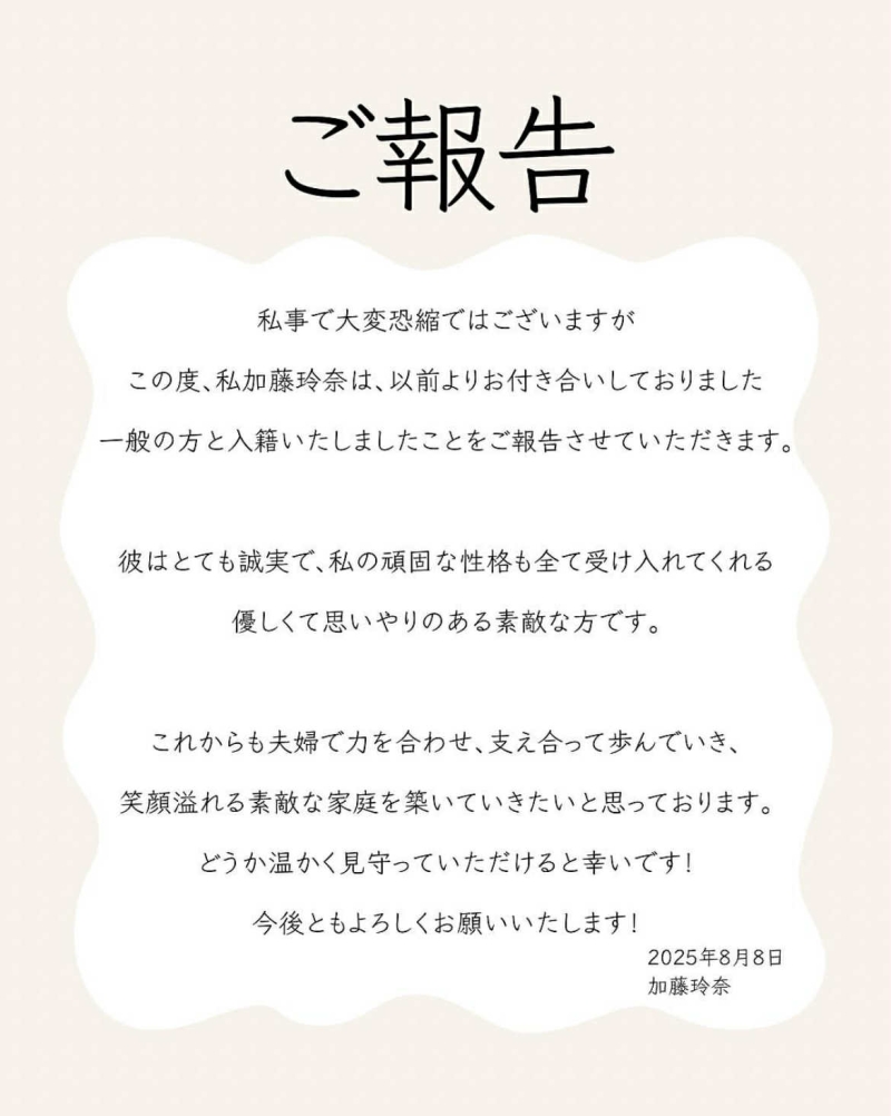 จากนี้ไป เรา จะเดินไปด้วยกันในฐานะคู่สามีภรรยา คอยสนับสนุนซึ่งกันและกัน และสร้างครอบครัวที่อบอุ่น เต็มไปด้วยรอยยิ้ม ฉันจะดีใจมากหากทุกคนคอยเป็นกำลังใจ และเฝ้ามองเราไปด้วยกันนะคะ ขอฝากเนื้อฝากตัวต่อไปด้วยค่ะ 8 สิงหาคม 2025 คาโต้ เรนะ