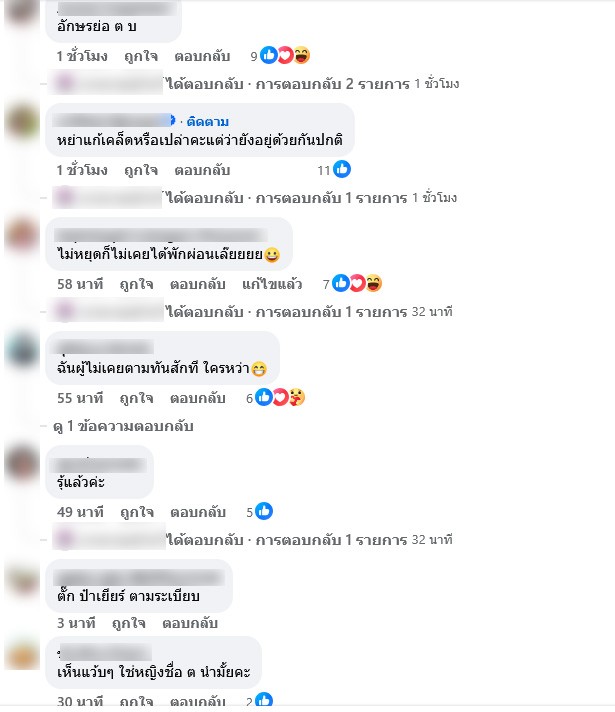 ท่ามกลางชาวเน็ตต่างเข้ามาคอมเมนต์กันนสนั่น อาทิ อักษรย่อ ต บ,หย่าแก้เคล็ดหรือเปล่าคะแต่ว่ายังอยู่ด้วยกันปกติ,ไม่หยุดก็ไม่เคยได้พักผ่อนเล๊ย,รุ้แล้วค่ะ