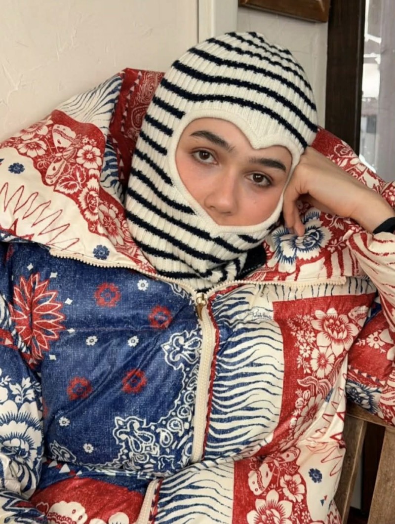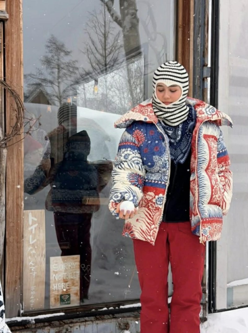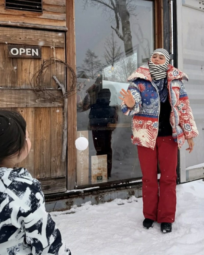 ครั้งนี้ เธอ เลือกสวมแจ็กเก็ตกันหนาวดีไซน์จัดจ้าน โทนสีตัดกันชัดเจน พร้อมแอ็กเซสซอรีหมวกไหมพรมลายเด่น ที่ช่วยเติมความโดดเด่นให้ลุคโดยรวมดูไม่ธรรมดา