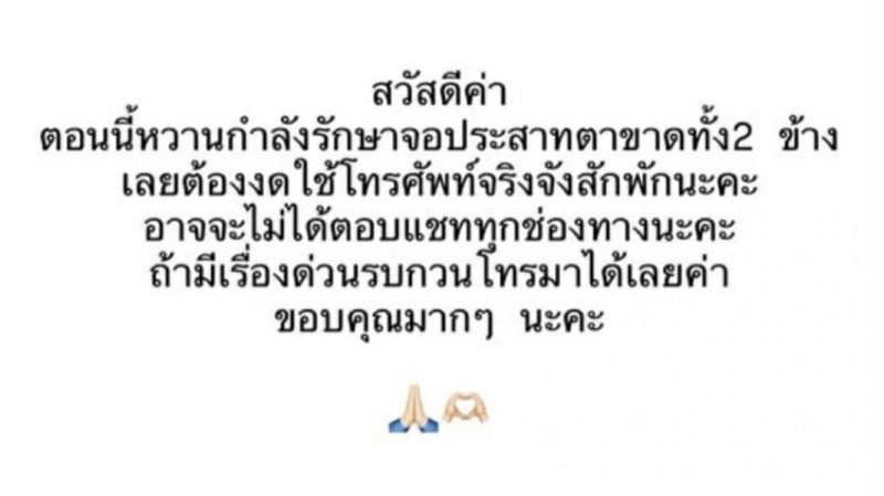 โดย เธอ เผยว่า ขณะนี้กำลังเข้ารับการดูแลรักษาอาการจอประสาทตาฉีกขาดทั้งสองข้าง แพทย์แนะนำให้ลดการใช้สายตาอย่างเคร่งครัด จึงต้องพักการเล่นโทรศัพท์ และโซเชียลมีเดียไปสักระยะ