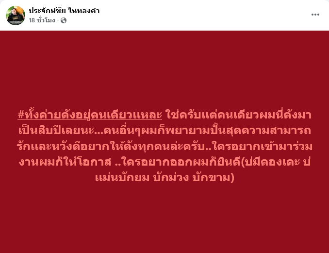 งานนี้ทำเอาแฟนๆต่างงงกันถ้วนหน้าเมื่อล่าสุด ประจักษ์ชัย ไหทองคำ ได้ออกมาโพสต์ข้อความระบุว่า #ทั้งค่ายดังอยู่คนเดียวเเหละ ใช่ครับเเต่คนเดียวผมนี่ดังมาเป็นสิบปีเลยนะ