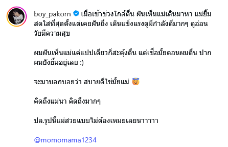 ผมฝันเห็นแม่แค่แปปเดียวก็สะดุ้งตื่น แต่เชื่อมั้ยตอนผมตื่น ปากผมยังยิ้มอยู่เลย จะมาบอกบอยว่า สบายดีใช่มั้ยแม่ คิดถึงแม่นา คิดถึงมากๆ ปล.รูปนี้แม่สวยแบบไม่ต้องเหมยเลยนา