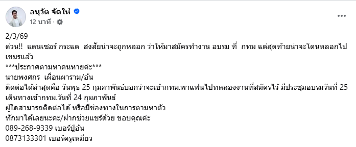 วันที่ 2 มีนาคม 69 ทาง อนุวัต จัดให้ ได้ออกมาโพสต์ว่า ด่วน!! แดนเซอร์ กระแต สงสัยน่าจะถูกหลอก ว่าให้มาสมัครทำงาน อบรม ที่ กทม แต่สุดท้ายน่าจะโดนหลอกไป เขมรแล้ว
