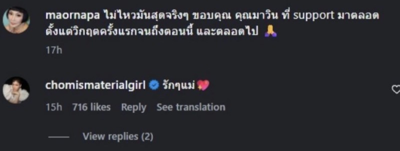 ขณะเดียวกัน เพื่อนในวงการบันเทิงก็ร่วมแสดงความห่วงใย โดย ชมพู่ อารยา เข้ามาคอมเมนต์ให้กำลังใจอย่างอบอุ่น