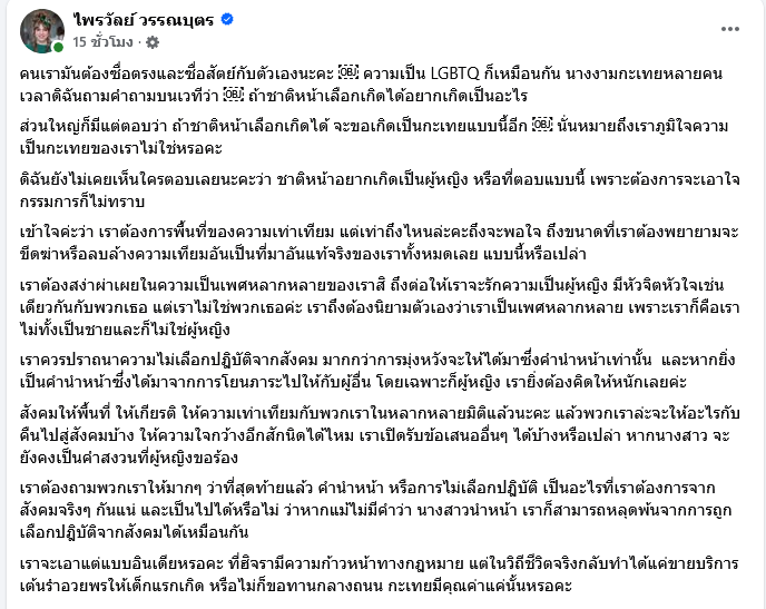 ยังคงเป็นประเด็นดราม่าที่ถกเถียงกันไปมาสำหรับเรื่องราวการเปลี่ยนคำนำหน้า ล่าสุดทางด้าน ไพรวัลย์ วรรณบุตร ได้ออกมาโพสต์ข้อความอีกมุมว่า คนเรามันต้องซื่อตรงและซื่อสัตย์กับตัวเองนะคะ ความเป็น LGBTQ ก็เหมือนกัน นางงามกะเทยหลายคน เวลาดิฉันถามคำถามบนเวทีว่า ถ้าชาติหน้าเลือกเกิดได้อยากเกิดเป็นอะไร