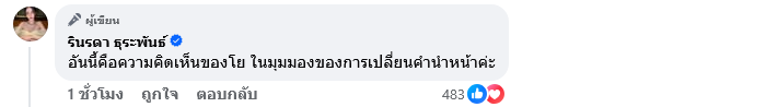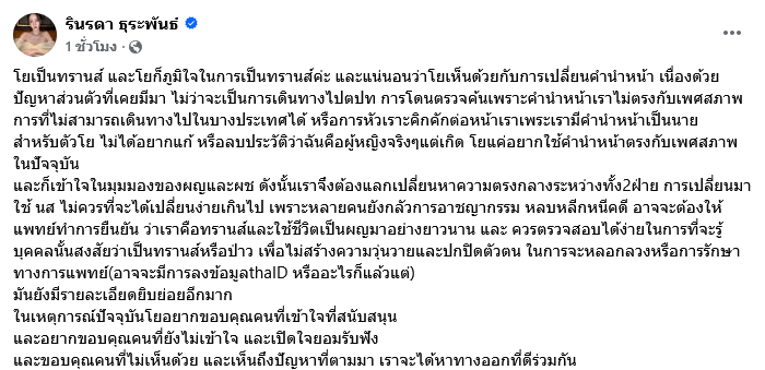 จากกรณีประเด็นดราม่าร้อนแรงของการเปลี่ยนคำนำหน้า ล่าสุด โยชิ รินลดา ได้ออกมาเเสดงความคิดเห็นระบุว่า โยเป็นทรานส์ และโยก็ภูมิใจในการเป็นทรานส์ค่ะ และแน่นอนว่าโยเห็นด้วยกับการเปลี่ยนคำนำหน้า เนื่องด้วยปัญหาส่วนตัวที่เคยมีมา ไม่ว่าจะเป็นการเดินทางไปตปท การโดนตรวจค้นเพราะคำนำหน้าเราไม่ตรงกับเพศสภาพ การที่ไม่สามารถเดินทางไปในบางประเทศได้