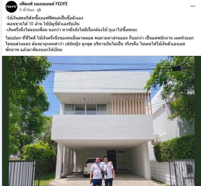 กลายเป็นประเด็นร้อนระอุบนโลกออนไลน์ทันที เมื่อทางด้านเพจเฟซบุ๊กชื่อดังระดับตำนานอย่าง เฟ็ดเฟ่ บอยแบนด์ (FEDFE) ได้ออกมาโพสต์แฉพฤติกรรมของบุคคลใกล้ชิดระบุว่า ใช้เงินสดบริษัทซื้อออฟฟิศแต่เป็นชื่อตัวเอง