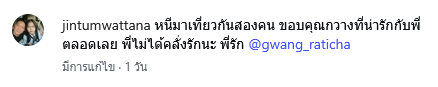 ล่าสุดทางด้าน จิน จรินทร์ ได้โพสต์ภาพคู่หวานใจพร้อมแคปชั่นระบุว่า หนีมาเที่ยวกันสองคน ขอบคุณกวางที่น่ารักกับพี่ตลอดเลย พี่ไม่ได้คลั่งรักนะ พี่รัก @gwang_raticha