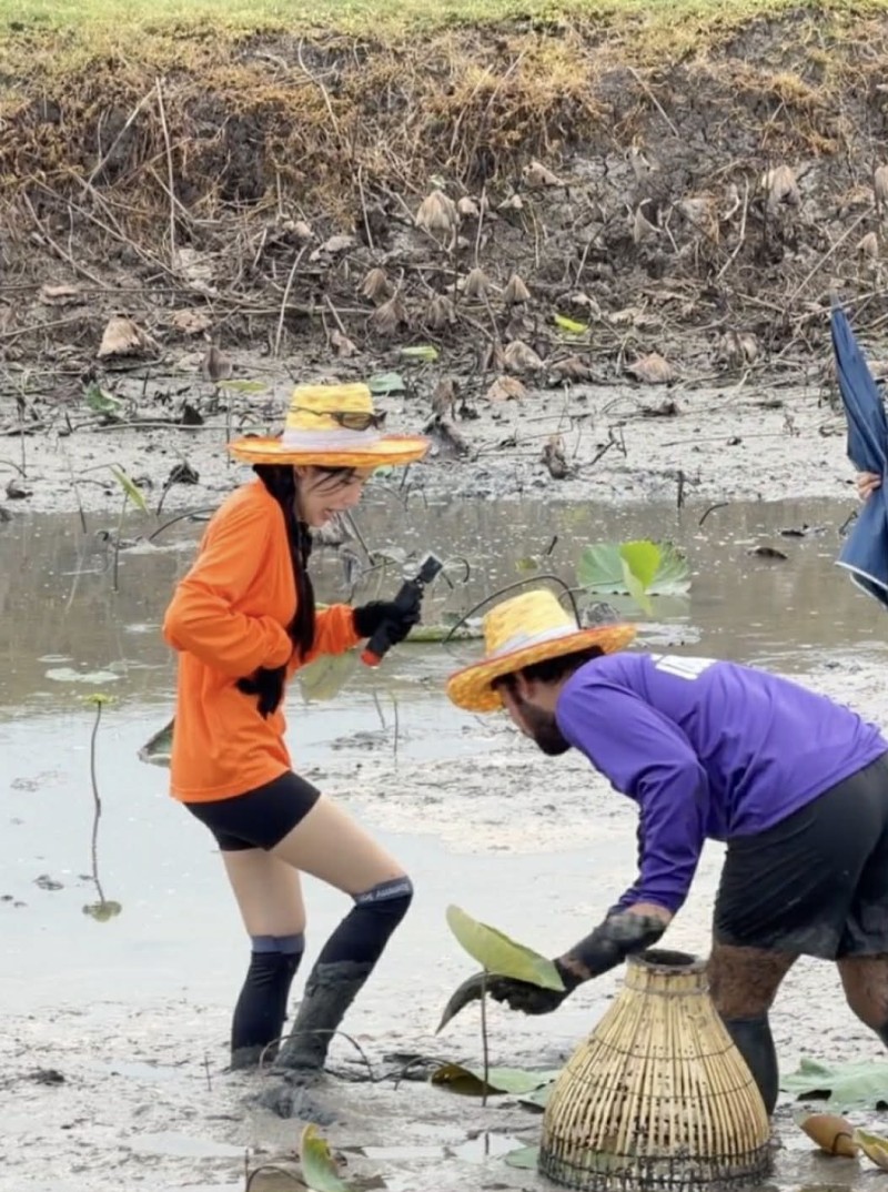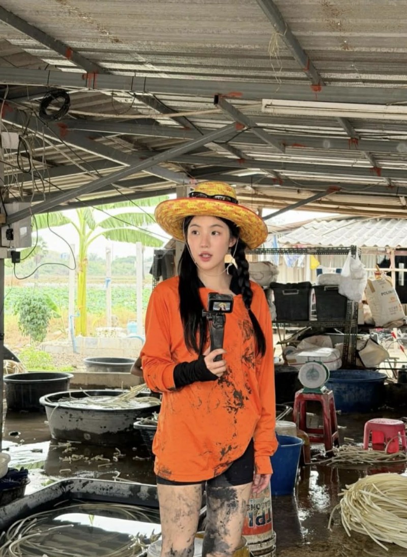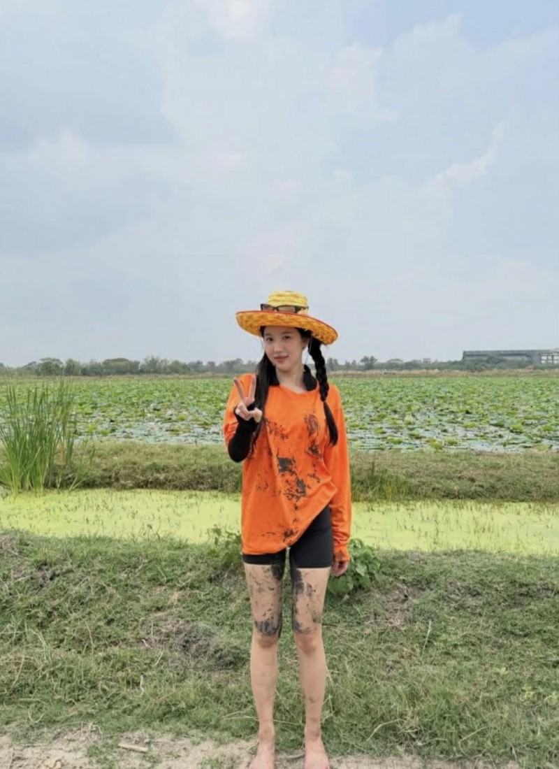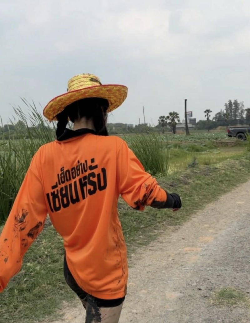 ในครั้งนี้ เธอ สวมเสื้อปุ๋ยสีส้ม และลงพื้นที่ลุยดินลุยโคลนแบบจริงจัง แต่ถึงจะเป็นลุคบ้านๆ ความสวยของเธอก็ยังโดดเด่นจนหลายคนต้องหันมามอง