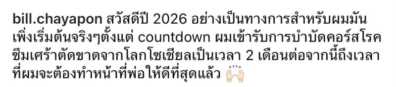ซึ่ง บิว เผยว่า ในช่วงเวลาที่ผ่านมา เขาเข้ารับการรักษาและบำบัดอาการ โรคซึมเศร้า ทำให้ต้องตัดขาดจากโซเชียลชั่วคราว เพื่อดูแลสภาพจิตใจของตัวเอง ก่อนย้ำว่า หลังจากนี้ตั้งใจจะโฟกัสกับการทำหน้าที่พ่ออย่างเต็มที่ ท่ามกลางกำลังใจจากผู้ติดตามจำนวนมาก