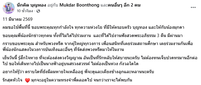 จากกรณีที่ แม่มุกดา บุญทอง รักษาตัวนาน 9 ปี มะเร็งลำไส้ระยะ 4 ลุกลามตับ-ปอด และได้เสียชีวิตไปแล้า ล่าสุด ทางด้าน นักแสดง นึกคิด บุญทอง ผู้เป็นสามี ได้ออกมาโพสต์ครั้งสุดท้าย เพื่อนส่งภรรยา โดยได้เผยว่า 11 มีนาคม 2569 ผมขอใช้พื้นที่นี้ ขอบพระคุณทุกกำลังใจ ทุกความห่วงใย ที่มีให้ครอบครัว บุญทอง และให้กับน้องมุกดา ขอบคุณพี่น้องนักข่าวทุกคน ทั้งที่ไม่ได้ไปร่วมงาน และที่ได้ไปงานฟังสวดพระอภิธรรม 3 คืน มีผ่านมา