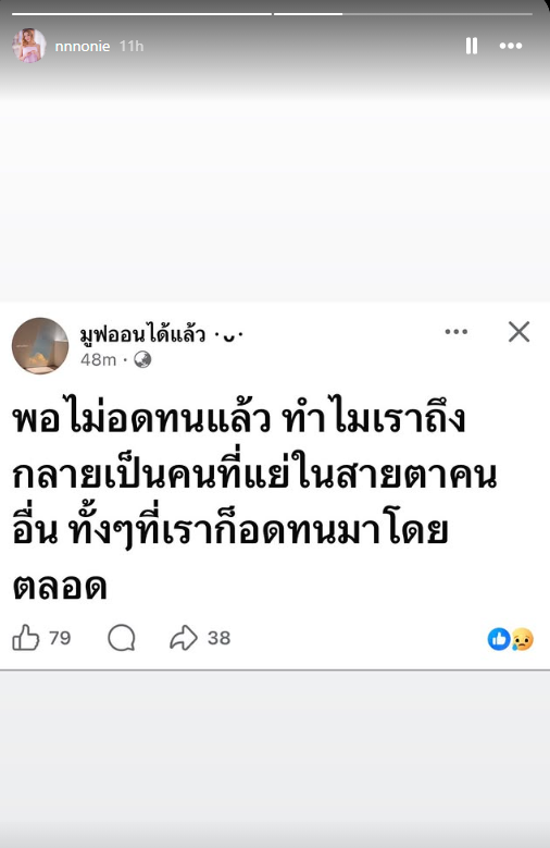 ลาสุด นนนี่ ได้ออกมาโพสต์ข้อความผ่านทางสตอรี่อินสตาแกรมอีกครั้ง โดยเป็นข้อความเชิงตัดพ้อที่ทำให้หลายคนอดเป็นห่วงไม่ได้ โดยข้อความดังกล่าวระบุว่า "พอไม่อดทนแล้ว ทำไมเราถึงกลายเป็นคนที่แย่ในสายตาคนอื่น ทั้งๆ ที่เราก็อดทนมาโดยตลอด"