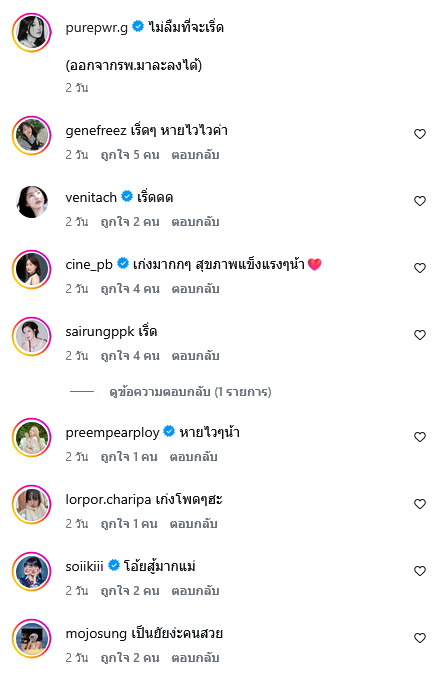 พร้อมเขียนแคปชั่นระบุว่า ไม่ลืมที่จะเริ่ด (ออกจากรพ.มาละลงได้) ท่ามกลางแฟนๆเเละคนในวงการต่างเข้ามาคอมเมนต์ส่งกำลังใจกันอย่างมาก
