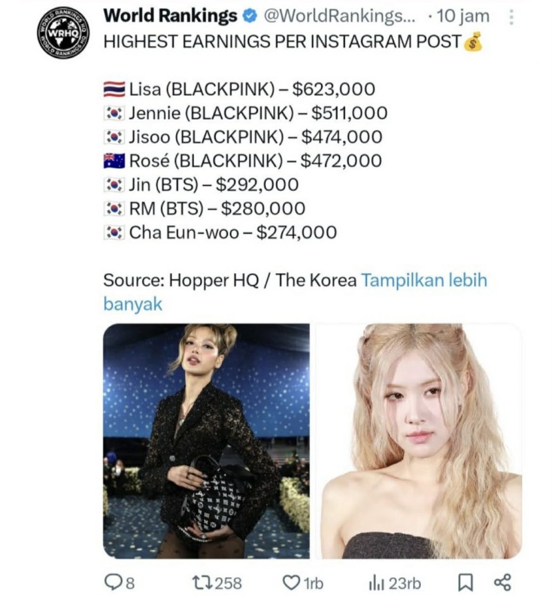 ขณะที่สมาชิกคนอื่นอย่าง เจนนี่ คิม , จีซู และ โรเซ่ ก็มีตัวเลขรายได้ต่อโพสต์ในระดับใกล้เคียงกัน สะท้อนถึงพลังอิทธิพลของทั้งวงในวงการแฟชั่น และแบรนด์ระดับลักชูรี