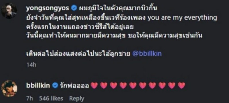 ทางด้าน ย้ง ทรงยศ สุขมากอนันต์ ยังส่งกำลังใจให้เดินหน้าตามเส้นทางของตัวเองต่อไป พร้อมอวยพรให้เจ้าตัวมีความสุขกับสิ่งที่กำลังทำ