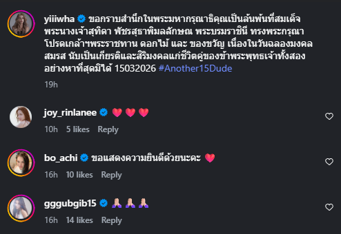 ล่าสุด ยิหวา ปรียากานต์ ได้ออกมาโพสตผ่านทางอินสตาแกรม ว่า ขอกราบสำนึกในพระมหากรุณาธิคุณเป็นล้นพ้นที่สมเด็จพระนางเจ้าสุทิดา พัชรสุธาพิมลลักษณ พระบรมราชินี ทรงพระกรุณาโปรดเกล้าฯพระราชทาน ดอกไม้ และ ของขวัญ เนื่องในวันฉลองมงคลสมรส นับเป็นเกียรติและสิริมงคลแก่ชีวิตคู่ของข้าพระพุทธเจ้าทั้งสองอย่างหาที่สุดมิได้ 15032026 #Another15Dude