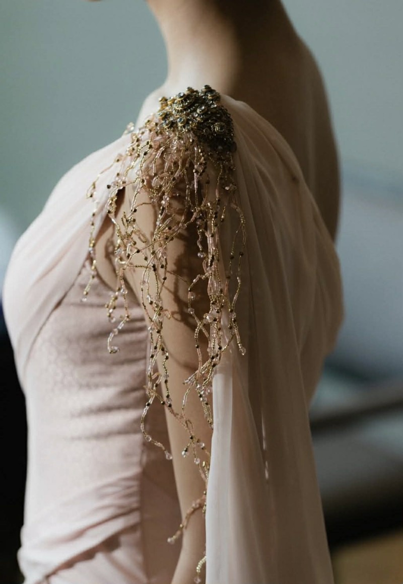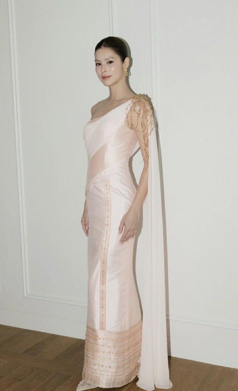 รายละเอียดช่วงตัวถูกออกแบบอย่างพิถีพิถัน ทั้งการจับเดรป และงานตกแต่งบริเวณไหล่ที่เพิ่มมิติให้ลุคดูมีความโดดเด่นมากขึ้น