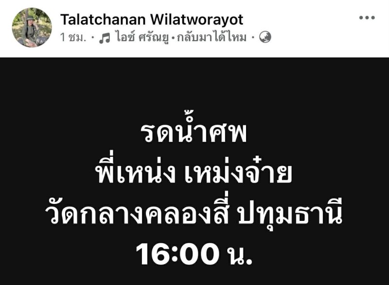 ล่าสุด แฟนสาวของเหน่ง ได้ออกมาโพสต์แจ้งกำหนดการพิธีทางศาสนา เพื่อให้ผู้ที่เคารพรักได้ร่วมไว้อาลัย