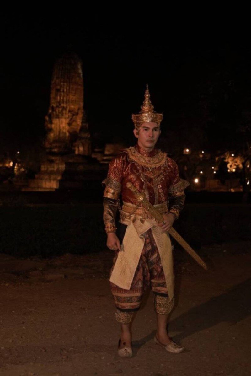 เข้าสู่พิธีเปิดเทศกาลโขนกรุงศรี ปีที่ 7 จัดขึ้นอย่างยิ่งใหญ่ ณ บริเวณหน้าพระปรางค์ วัดพระราม จังหวัดพระนครศรีอยุธยา มาในเครื่องทรงกษัตริย์โบราณเต็มยศ โทนสีแดงทองสะดุดตา