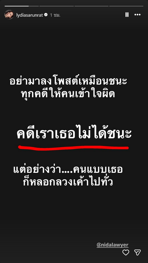 อย่ามาลงโพสต์เหมือนชนะทุกคดีให้คนเข้าใจผิด คดีเราเธอไม่ได้ชนะ แต่อย่างว่า คนแบบเธอก็หลอกลวงเค้าไปทั่ว