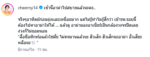 เรียกได้ว่าเป็นข่าวเศร้าของนักแสดงสาวเลยทีเดียวสำหรับ เชียร์ ฑิฆัมพร ที่ล่าสุดได้ออกมาแจ้งข่าวสูญเสียอาม่าบุคคลอันเป็นที่รัก เช้านี้อาม่าไปสบายแล้วนะคะ จริงๆอาทิตย์ก่อนยุ่งเเละเหนื่อยมาก แต่ไม่รู้ทำไมรู้สึกว่า เข้ารพ.รอบนี้ต้องไปหาอาม่าให้ได้