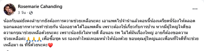 ทำเอาแฟนๆต่างส่งกำลังใจกันอย่างล้นหลามเมื่อล่าสุดอดีตนักร้องดัง โรสเเมรี่ คาฮันดิง กำลังประสบปัญหาหลายด้าน และเจ้าตัวป่วยเป็นโรคซึมเศร้า แม้จะพยายามหางานทำหลายรูปแบบ ทั้งรับจ้างทั่วไป โปรโมตขายของตามสื่อออนไลน์ ล่าสุด โรสเมรี่ ได้โพสต์ข้อความขอความช่วยเหลือระบุว่า